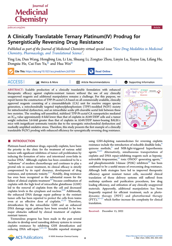 3月10日,伟德国际VICTOR1946魏华/喻翠云教授团队在药物化学领域国际一流期刊Journal of Medicinal Chemistry(中科院1区,IF:8.039)在线发表了题为“A Clinically Translatable Ternary Platinum (IV) Prodrug for Synergistic Reversing Drug Resistance(2023,DOI: 10.1021/acs.jmedchem.2c01924.)”的研究论文。