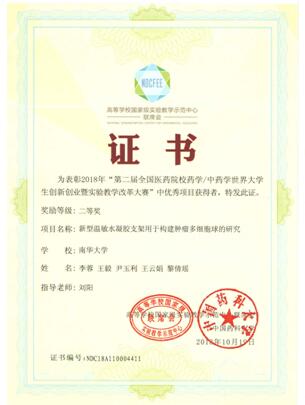 10月17日-19日,由高等公司国家级实验教学示范中心联席会和中国药科大学主办,天津大学药物科学与技术公司承办的“第二届医药院校药学/中药学世界老员工创新创业暨实验教学改革大赛”在天津举办。经过初选函评和现场答辩等多环节激烈角逐,由公司选送的伟德国际VICTOR1946刘阳老师指导的“生物医用水凝胶创新团队”的成员李蓉、王毅、尹玉利、王云娟、黎倩瑶等参与的项目最终荣获员工创新创业二等奖。