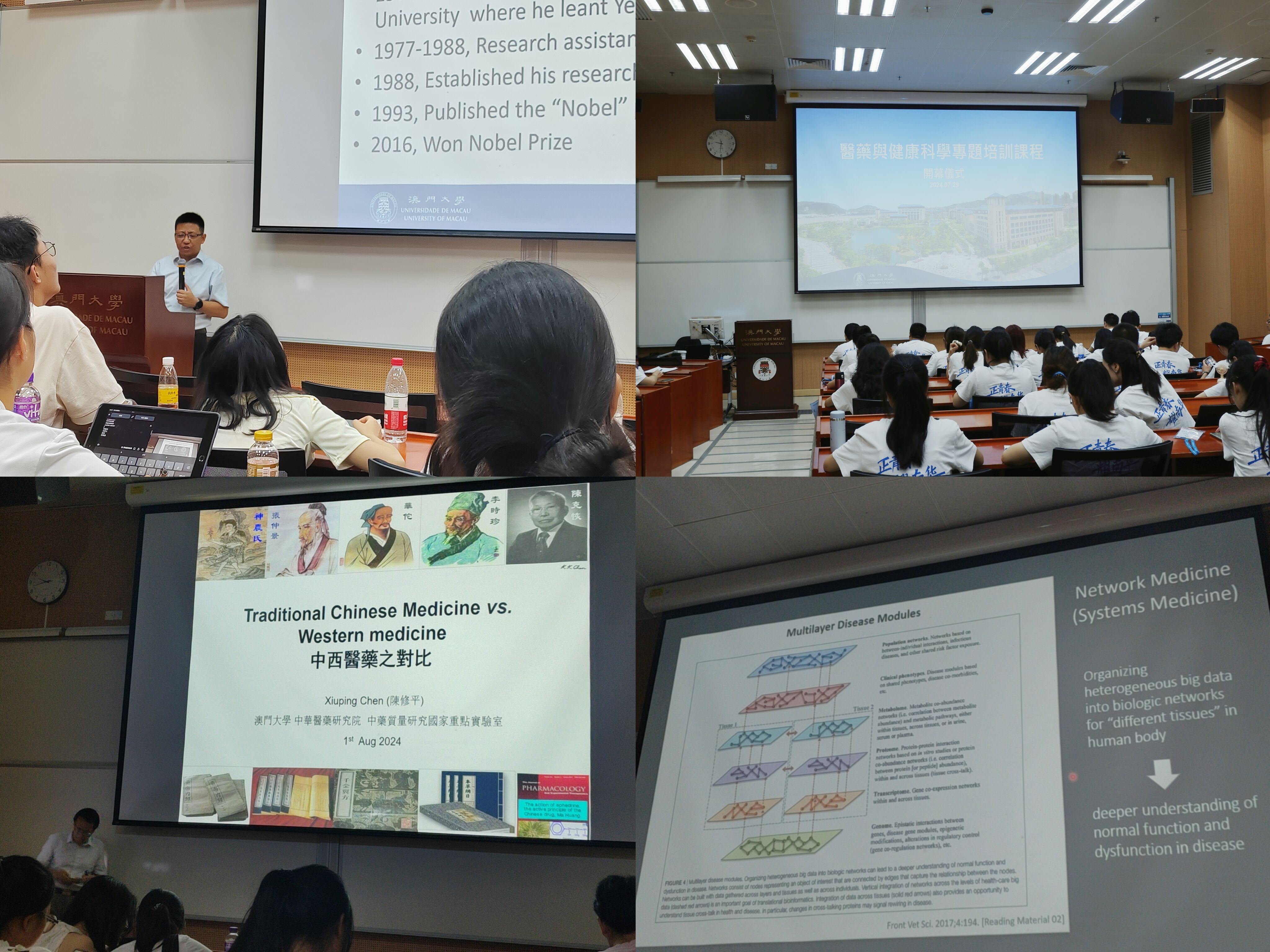 线下研学期间,澳门大学多位知名教授为员工们带来了精彩的学术讲座:黄冠豪教授介绍了“基因与生物信息学基础与前沿”,路嘉宏教授探讨了“癌症和神经退行性疾病中的自噬溶酶体途径”,潘全威教授介绍了“精准医学与大数据:革命与商机”,陈修平教授则分享“中西药的比较”。讲座内容不仅前沿且贴近实际,极大地启发员工兴趣和思考。