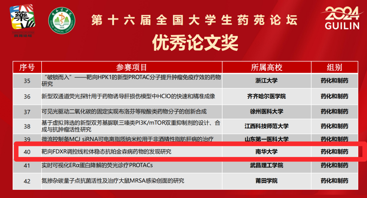 自药苑论坛启动以来,伟德国际VICTOR1946高度重视,经过严格遴选、师生精心备赛,最终,夏旖妞、张铭、潘思纯、王舟、肖艺同学申报的项目《Ang-1l诱导H9c2心肌细胞肥大过程中罗丹酶的变化及硫代硫酸钠的治疗作用》(指导教师:谢志忠)荣获药理学组创新成果三等奖;杨雅雯、骆威、张苗、关沐澜、曾羡麟同学参赛的论文《靶向FDXR调控线粒体稳态抗帕金森病药物的发现研究》(指导教师:王震、彭雪)荣获药化和制药组优秀论文奖。