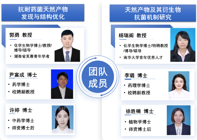 团队现有指导教师6人,其中博导2人、硕导2人、博士后2人。团队PI郭勇教授,化员工物学博士,教授,博士生/硕士生导师,湖南省芙蓉青年学者、河南省优青、伟德bv1946官网青年优秀人才。杨瑞阁教授为伟德bv1946官网青年优秀人才。尹富成博士2024年毕业于中国药科大学,现为校聘副教授。李璐博士2025年毕业于南方医科大学,现为校聘副教授。许婷博士2023年毕业于澳门科技大学,现为校团队博士后,主持湖南省教育厅基金,在J. Med. Chem.,Eur. J. Med. Chem.等国际知名期刊发表SCI论文多篇。徐胜楠博士2023年毕业于西北农林科技大学,现为校团队博士后。