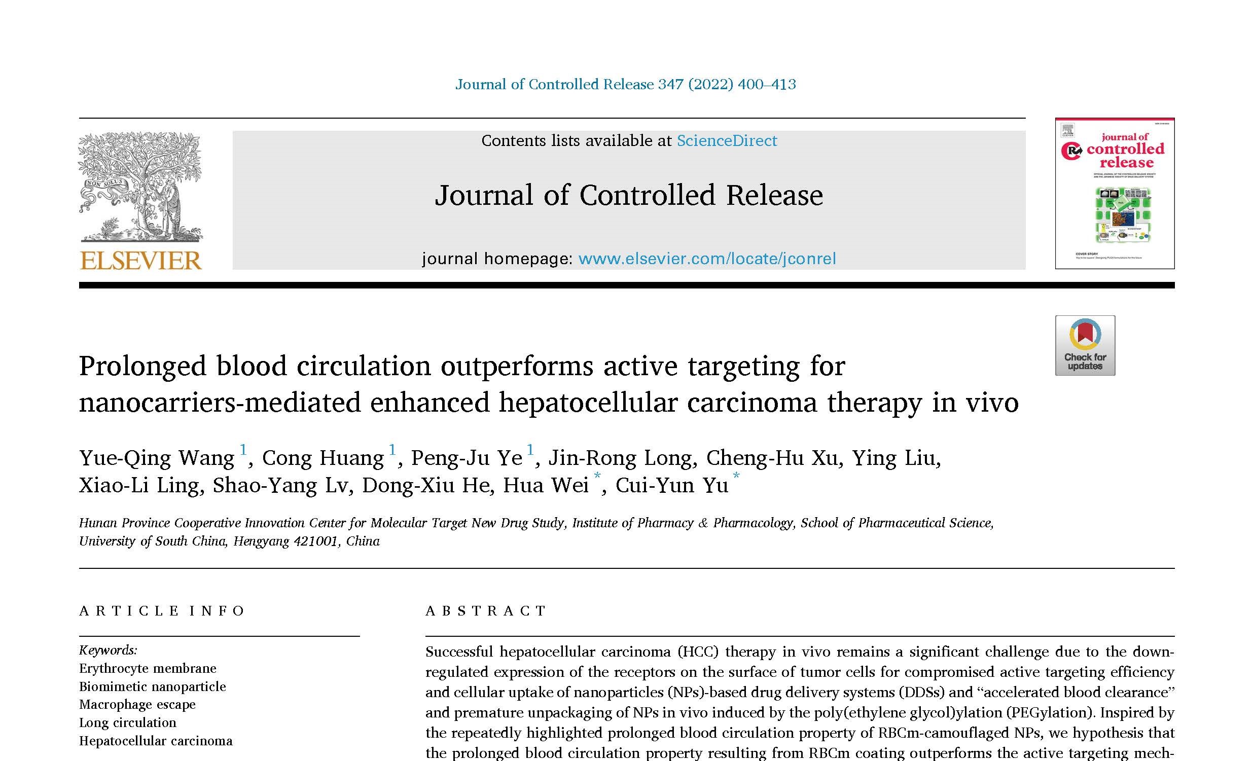 近日,伟德国际VICTOR1946魏华教授和喻翠云教授联合科研团队在药剂学国际一流期刊Journal of Controlled Release(简称JCR,医学1区,TOP期刊,IF:9.776)上发表了题为“Prolonged Circulation Outperforms Active Targeting for Enhanced Hepatocellular Carcinoma Therapy(2022, 347, 400-413.)”的研究论文。该研究通过红细胞膜包裹天然多糖基聚合物前药纳米粒子构筑了仿生纳米载体,在小鼠体内实现了针对肝癌的高效治疗。研究首次揭示了红细胞膜赋予仿生纳米载体的血液长循环性能比纳米载体自身的肝癌细胞主动靶向性能在针对肝癌的体内治疗中发挥着更为重要的作用。仿生纳米载体在大鼠体内的血液循环半衰期(t1/2)是聚合物前药纳米粒子的3倍,是小分子化疗药物阿霉素的3.5倍,因而仿生纳米载体在荷瘤小鼠体内展现了最好的抑瘤效果。该研究为肝癌的临床高效治疗提供了理论指导。伟德国际VICTOR1946硕士研究生汪月琴、黄聪和叶鹏举为共同第一作者,伟德国际VICTOR1946喻翠云教授和魏华教授为共同通讯作者。这是该研究团队在近一年的时间内,连续在JCR上发表的第五篇科研成果。