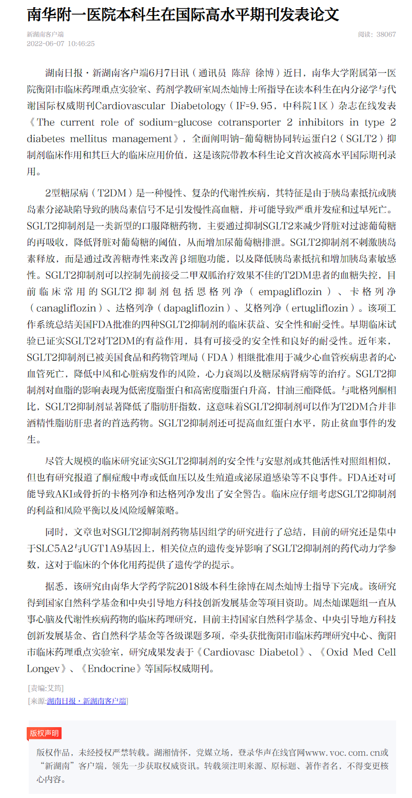 该研究由2018级本科生徐博在周杰灿博士指导下完成。该研究得到国家自然科学基金和中央引导地方科技创新发展基金等项目资助。周杰灿课题组一直从事心脑及代谢性疾病药物的临床药理研究,目前主持国家自然科学基金、中央引导地方科技创新发展基金、省自然科学基金等各级课题多项,牵头获批衡阳市临床药理研究中心、衡阳市临床药理重点实验室,研究成果发表于《Cardiovasc Diabetol》、《Oxid Med Cell Longev》、《Endocrine》等国际权威期刊(https://m.voc.com.cn/wxhn/article/202206/202206071046253583.html)。