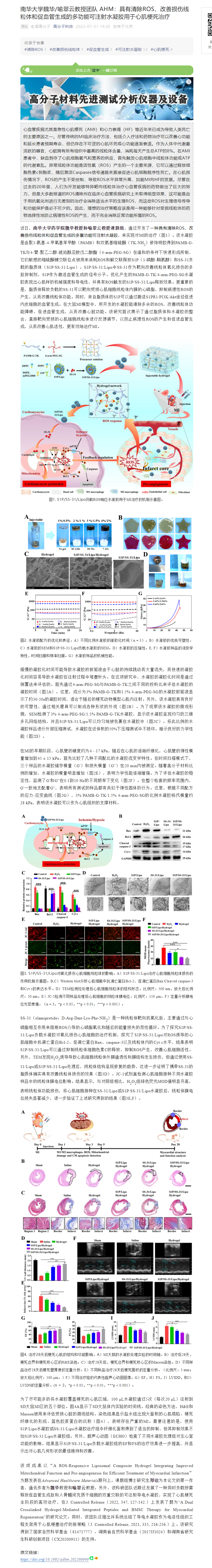 近日,伟德国际VICTOR1946魏华教授和喻翠云教授课题组,通过开发了一种具有清除ROS、改善损伤线粒体和促血管生成的多重功能可注射水凝胶,来实现对MI的治疗(图1)。该水凝胶是由聚3-氨基-4-甲氧基苯甲酸(PAMB)和双氨基缩硫酮(TK-NH2)修饰明胶得到PAMB-G-TK与4-臂-聚乙二醇-琥珀酰亚胺戊二酸酯(4-arm-PEG-SG)在温和的条件下快速形成所制,它们敏感的缩硫酮键交联位点被用来消耗ROS和解交联释放S1P(1-磷酸-鞘氨醇)和SS-31负载的脂质体(S1P/SS-31/Lipo)。S1P/SS-31/Lipo中SS-31作为靶向改善线粒体氧化损伤的多肽抑制剂,S1P作为激活血管生成的信号分子。优化产生的PAMB-G-TK/4-arm-PEG-SG水凝胶表现出心肌样的机械强度和导电性,并具有ROS触发的S1P/SS-31/Lipo释放效果。更重要的是,脂质体释放负载的SS-31可以靶向受损心肌细胞线粒体内膜的心磷脂,抑制病理性ROS的产生,从而改善线粒体功能。同时,来自脂质体的S1P可以通过激活S1PR1/PI3K/Akt途径促进内皮细胞的血管生成。在大鼠MI模型中,所开发的水凝胶能清除多余的ROS,改善线粒体功能障碍,促进血管生成,从而改善心脏功能。该研究首次揭示了通过脂质体和水凝胶的整合,直接靶向受损的心肌细胞线粒体进行反馈调节,以防止病理性ROS的产生和促进血管生成,从而改善心肌活性,更有效地治疗MI。