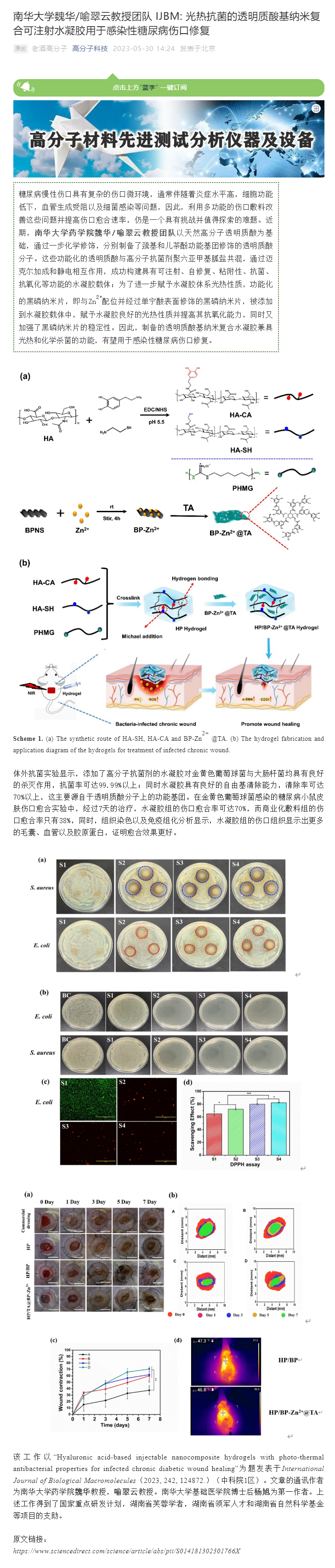糖尿病慢性伤口具有复杂的伤口微环境,通常伴随着炎症水平高,细胞功能低下,血管生成受阻以及细菌感染等问题,因此,利用多功能的伤口敷料改善这些问题并提高伤口愈合速率,仍是一个具有挑战并值得探索的难题。近期,伟德国际VICTOR1946魏华/喻翠云教授团队以天然高分子透明质酸为基础,通过一步化学修饰,分别制备了巯基和儿茶酚功能基团修饰的透明质酸分子。这些功能化的透明质酸与高分子抗菌剂聚六亚甲基胍盐共混,通过迈克尔加成和静电相互作用,成功构建具有可注射、自修复、粘附性、抗菌、抗氧化等功能的水凝胶载体;为了进一步赋予水凝胶体系光热性质,功能化的黑磷纳米片,即与Zn2+配位并经过单宁酸表面修饰的黑磷纳米片,被添加到水凝胶载体中,赋予水凝胶良好的光热性质并提高其抗氧化能力,同时又加强了黑磷纳米片的稳定性。因此,制备的透明质酸基纳米复合水凝胶兼具光热和化学杀菌的功能,有望用于感染性糖尿病伤口修复。