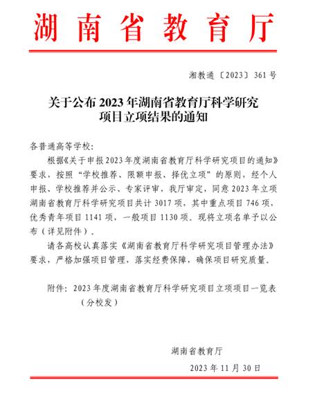 11月30日,湖南省教育厅2023年项目资助评审结果公布,伟德国际VICTOR1946苏波、彭雪、孙少卫、王姝之4位教师获得2023年湖南省教育厅重点项目立项资助,王卫国、江伟凡、张宇、刘映、彭颖、刘阳6位教师获得2023年湖南省优秀青年项目立项资助。