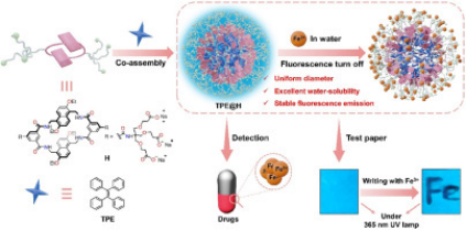 铁离子(Fe3+)对生物体和环境都至关重要,铁离子失衡可能导致各种疾病和环境问题。因此,铁离子的检测在多个领域均具有重要意义。该团队利用水溶性四内酰胺大环和四苯乙烯共组装制备了一种新型基于聚集诱导发光点(AIE-dots)的超分子组装体。利用该组装体对Fe3+的特异性荧光响应实现了家庭用水、血清和药物中Fe3+的准确检测。该成果发表在Dyes and Pigments(Dyes Pigments,2025,232,112456)。