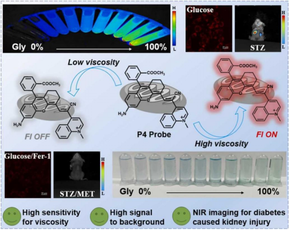 糖尿病肾损伤已成为导致肾脏疾病的重要原因之一。早期发现和干预可以有效延缓肾脏疾病的发展。粘度作为细胞微环境的关键参数,在维持线粒体功能和细胞稳态中起着关键作用,其失调与糖尿病肾损伤的发病机制密切相关。然而,很少有报道使用荧光探针来确定糖尿病肾损伤过程中的线粒体粘度变化。在此,该团队使用“渐进优化”策略开发了一种基于半花菁的近红外荧光探针P4,能够对肾细胞和体内线粒体粘度变化进行靶向成像。P4探针对粘度具有高灵敏度和选择性,在具有高线性关系的高粘度环境中表现出约146倍的信号增强。P4的荧光量子产率从PBS(低粘度)中的< 0.001增加到90%甘油(高粘度)中的0.12。此外,P4探针显示出优异的线粒体定位效率,能够在糖尿病肾损伤进展和治疗干预期间实时监测线粒体粘度变化。P4探针在糖尿病肾损伤小鼠模型中检测到肾脏粘度变化,与健康组照相比,信号强度增加了1.5倍。使用P4探针,首次在高葡萄糖诱导的肾细胞损伤模型中观察到粘度变化与铁死亡相关。这项工作将为更深入地了解肾脏疾病的粘度变化提供有意义的工具,并有望促进肾脏疾病的早期诊断和治疗。相关研究成果以“Fabricating a mitochondrial viscosity-activated fluorescent probe for highly sensitive imaging of kidney injury in vivo”为题发表在国际权威期刊《Sensors and Actuators B: Chemical》(中科院一区TOP期刊,影响因子8.0);本项工作由团队硕士生郑显贵和助理研究员张红帅博士为共同第一作者完成,伟德bv1946官网附属南华医院程丹研究员和伟德国际VICTOR1946何隆薇教授为本文通讯作者。