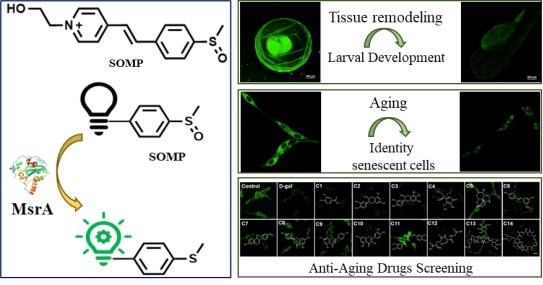 细胞增殖与衰老是密切相关的生物学过程,在组织重塑、应激反应及衰老相关疾病中扮演着双重角色。然而,细胞衰老的动态复杂性使得传统检测方法难以实现活细胞内生物标志物的原位精准监测,导致关键生物学信息丢失。研究表明,MsrA活性降低会缩短秀丽隐杆线虫、果蝇、小鼠等多种模式生物的寿命,而提高其表达水平则可延缓衰老并促进健康寿命。因此,MsrA被视为调控细胞衰老的关键分子靶点。为此,研究团队设计了由苯乙烯基吡啶鎓染料和亚砜基团构成的特异性MsrA荧光探针SOMP。该探针具有超高灵敏度(检测限达8.9 ng/mL)、优异的选择性(受MsrB2/B3干扰极小)和低细胞毒性的优势,适用于细胞长期观测。基于SOMP的卓越性能,该研究实现了多项创新应用:1)原位监测细胞增殖与幼体发育:首次在活细胞及模式生物中动态可视化MsrA活性变化。2)精准评估衰老进程:在多种衰老模型中成功追踪MsrA的活性变化,为衰老机制研究提供新方法。3)高通量抗衰老药物筛选:利用SOMP首次发现姜黄素的抗衰老作用可能与MsrA介导的氧化还原信号相关,为天然抗衰老药物开发提供新线索。该研究开发的SOMP探针突破了传统检测技术的局限,为细胞衰老的原位分析、衰老相关疾病机制探索及抗衰老药物开发提供了高效、可靠的新工具,有望为精准医学与衰老相关领域提供无创原位可视化新方法。该成果以“A Novel Visual Perspective for Tracking of Larval Development, Aging and Anti-Aging Drugs Screening by Fluorescent Sensing MsrA”为题发表于国际权威期刊《Analytical Chemistry》(中科院一区TOP期刊,影响因子6.8);该研究由团队博士研究生曾佳玉、伟德国际VICTOR1946硕士研究生杨婷作为共同第一作者完成,伟德bv1946官网附属第一医院周佳主任、附属南华医院程丹研究员和伟德国际VICTOR1946何隆薇教授为通讯作者。