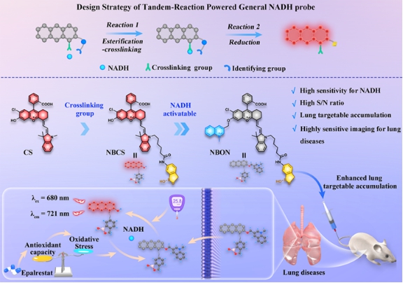 糖尿病作为一种全球高发的临床代谢性疾病,其长期高血糖状态可引发多器官并发症,但肺部作为糖尿病靶器官的病理机制(如NADH/NAD⁺失衡诱导氧化应激)长期缺乏实时监测工具。传统NADH探针因灵敏度低(检测限μM级)、组织穿透性差(可见光成像)及非特异性干扰等问题,难以实现活体深部组织(如肺部)的精准检测。为此,本研究提出一种基于串联反应策略的近红外(NIR)荧光试剂NBON,通过结合苯硼酸靶向基团(邻近二醇酯化交联)与半菁染料荧光基团(NIR发射波长721 nm),实现了NADH的高灵敏度检测(检测限45 nM)及肺部特异性富集。在细胞层面,NBON成功揭示了高糖环境下NADH的动态波动及依帕司他(EPS)通过抑制醛糖还原酶恢复氧化还原平衡的机制;在动物模型中,该探针实时成像链脲佐菌素(STZ)诱导的糖尿病小鼠肺部NADH异常累积,并评估了二甲双胍/EPS的治疗效果;此外,NBON还可区分肺转移瘤与原位肿瘤组织,辅助术中精准切除。这一研究不仅填补了NADH活体动态监测的技术空白,首次在分子层面阐明EPS缓解糖尿病肺病的抗氧化机制,更为糖尿病并发症诊疗、药物开发及肿瘤精准手术提供了通用化工具,推动了代谢性疾病研究与临床转化的深度融合。该成果以“Tandem reaction-powered near-infrared fluorescent molecular reporter for real-time imaging of lung diseases”为题发表在国际权威期刊《Chemical Science》(中科院1区TOP期刊,影响因子7.6);伟德国际VICTOR1946和附属南华医院为本论文通讯单位,团队成员硕士生胡琰、助理研究员张红帅博士和硕士生丁一腾为论文的共同第一作者,伟德bv1946官网附属南华医院程丹研究员和伟德国际VICTOR1946何隆薇教授为论文的共同通讯作者。