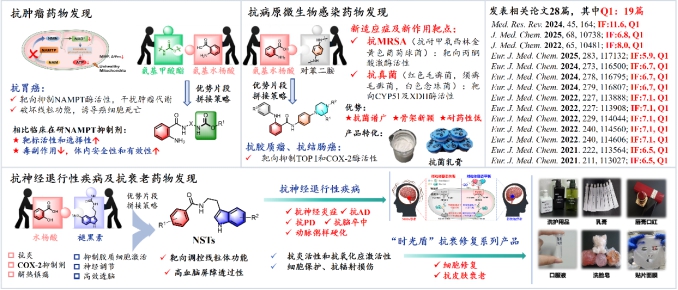 伟德bv1946官网药物设计与研发团队长期致力于基于片段的药物分子设计,以邻氨基苯甲酰为母核,融合具有良好成药性和明确定义靶点的药效片段,围绕肿瘤、病原微生物感染及神经退行性等重大疾病,发现了多个具备临床开发价值的抗真菌/细菌、抗胃癌、抗线粒体损伤相关性疾病的候选药物。目前,该团队正积极推进科技成果转化,依托自主成立的衡阳泽岐生物医药有限公司,在A轮融资的支持下完成了抗菌乳膏、修复面膜、抗菌日化品等多个品种的初步工艺研究,未来将开展下一轮的项目融资,全力推进产品落地应用。
