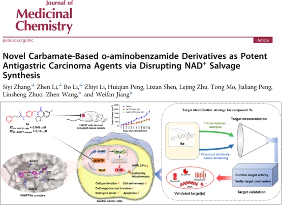 代谢重编程是恶性肿瘤的重要特征之一,其中烟酰胺腺嘌呤二核苷酸(NAD⁺)作为能量代谢和多种细胞生存通路的核心辅酶,在肿瘤发生发展中发挥关键作用。烟酰胺磷酸核糖转移酶(NAMPT)是NAD⁺挽救合成途径的限速酶,在胃癌中普遍高表达,被认为是具有潜力的抗肿瘤治疗靶点。近年来,伟德国际VICTOR1946江伟凡博士所在王震教授团队围绕NAMPT靶向抗胃癌小分子药物开展了系统研究,并在国际药物化学权威期刊Journal of Medicinal Chemistry上连续发表研究成果,逐步推动相关研究由靶点发现向高效、安全、可转化候选分子迈进。在2025年6月发表的研究工作中(https://doi.org/10.1021/acs.jmedchem.4c02686),团队以前期发现的邻氨基苯甲酰胺类化合物F8为先导,通过结构修饰获得化合物9a。研究首次从分子和代谢层面明确9a为一种NAMPT抑制剂,可通过降低肿瘤细胞内NAD⁺和ATP水平,抑制未分化型胃癌细胞的增殖、迁移和克隆形成。该研究完成了NAMPT作为抗胃癌有效靶点的确证,为后续结构优化奠定了坚实基础。