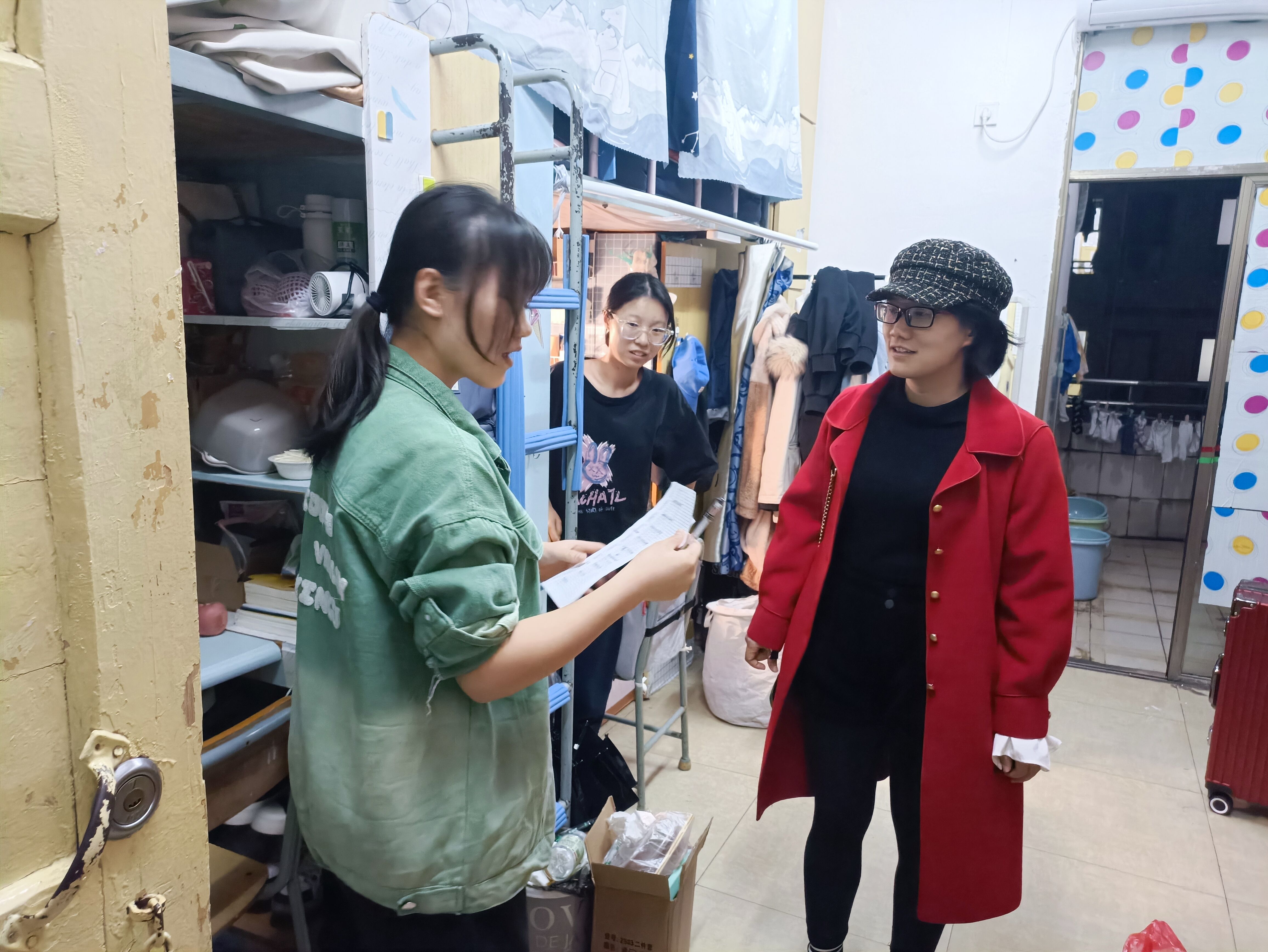 在本次宿舍走访过程中,辅导员与同学们亲切交谈,要同学们正确认识此次劳动竞赛,积极参与到竞赛中来,培养劳动意识与习惯,用自己勤劳的双手,净化、亮化、美化宿舍生活环境,共同维护和谐美好的校园。同时,辅导员还对宿舍安全、卫生情况进行排查,叮嘱同学们注意宿舍用电安全以及宿舍整洁和卫生,勉励同学们要克服疫情防控工作带来的不便,提醒大家在公共场合佩戴口罩,做好个人防护。