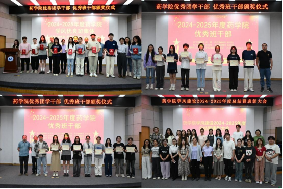 药拔2201班等学风优良班集体、药学2205班王鑫等优秀员工干部、丁雯等优秀团学干部以及第四届“药承文明·置身书境”阅读活动获奖个人受到表彰,应邀出席表彰会的班主任为获奖集体和个人颁奖。