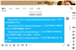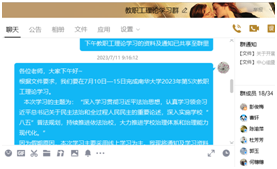 7月11日上午,支部通过教职工理论学习QQ群组织集体理论学习,学习内容主要包括《习近平法治思想学习纲要》、《习近平新时代中国特色社会主义思想专题摘编》(P273-301页)、《习近平新时代中国特色社会主义思想学习纲要(2023年版)》(P100-114页)、习近平著作选读》第一卷(P297-310页)和习近平著作选读》第二卷(P568-573页)等重要书籍和《中华人民共和国宪法》、《中华人民共和国教师法》、《中华人民共和国高等教育法》等法律法规。
