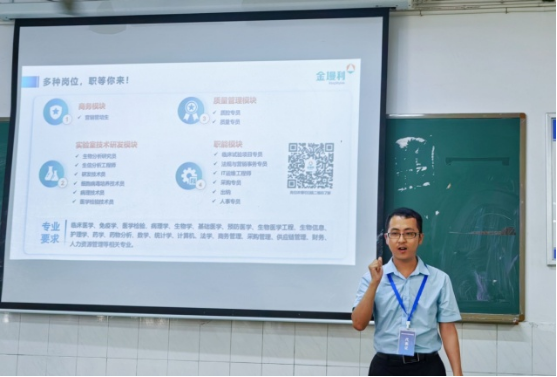 首先,来自金墁利医药的聂老师为同学们作企业发展建设情况介绍。金墁利医药坚持以“高保障、广覆盖、多检测、全技术、专智库、优共享”,致力为全球制药行业提供科学、合规、一站式的临床试验中心实验综合解决方案,以打造无缝衔接的全服务链。宣讲人以“你将有什么收获”为主题,向同学们介绍了金墁利医药薪酬福利、就业岗位内容、人才培养模式及晋升通道等。金墁利医药采用“721”的人才培养模式:70%的工作实践、20%的教练1V1带练和10%的丰富培训课程;并提出两条晋升路线,一条以专员—主管—经理—总监—副总经理为路线;另一条则为初级检验师—中级检验师—高级检验师—资深检验师—检验专家。就业岗位分为商务模块、质量管理模块、实验室技术研发模块和职能模块等四个模块。