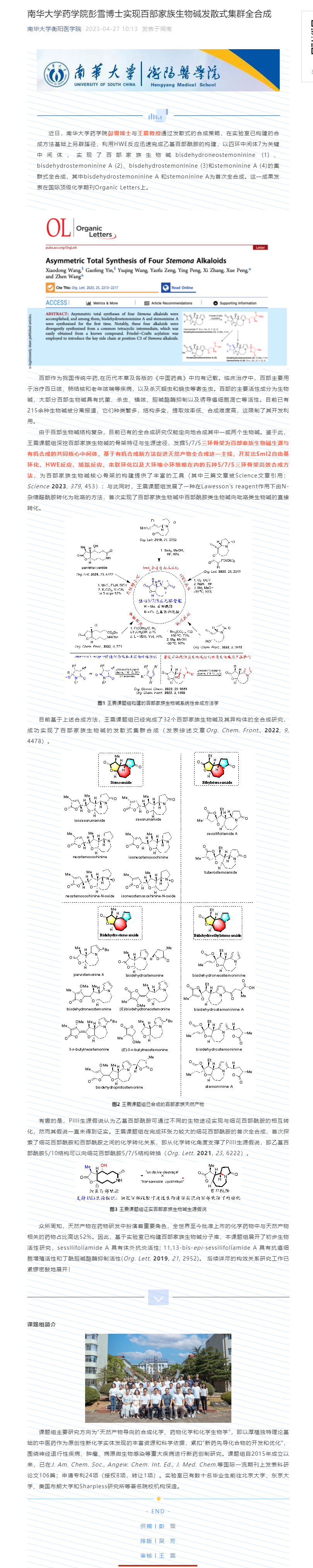 伟德国际VICTOR1946/肿瘤微环境响应药物研究湖南省重点实验室彭雪博士与王震教授通过发散式的合成策略,在实验室已构建的合成方法基础上另辟蹊径,利用HWE反应迅速完成乙基百部酰胺的构建,以四环中间体7为关键中间体,实现了百部家族生物碱bisdehydroneostemoninine (1)、bisdehydrostemoninine A (2)、bisdehydrostemoninine (3)和stemoninine A (4)的集群式全合成,其中bisdehydrostemoninine A 和stemoninine A为首次全合成。这一成果发表在国际顶级化学期刊Organic Letters上。